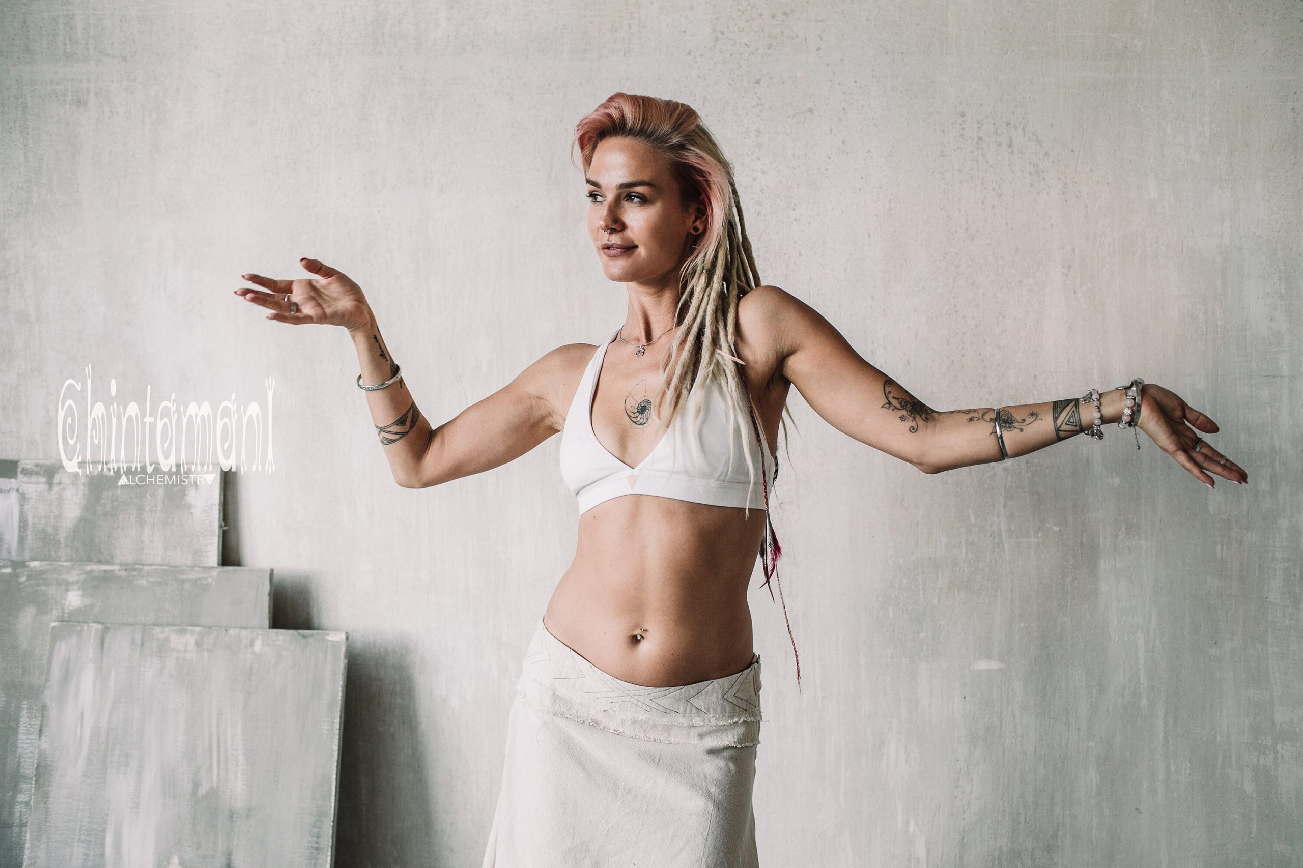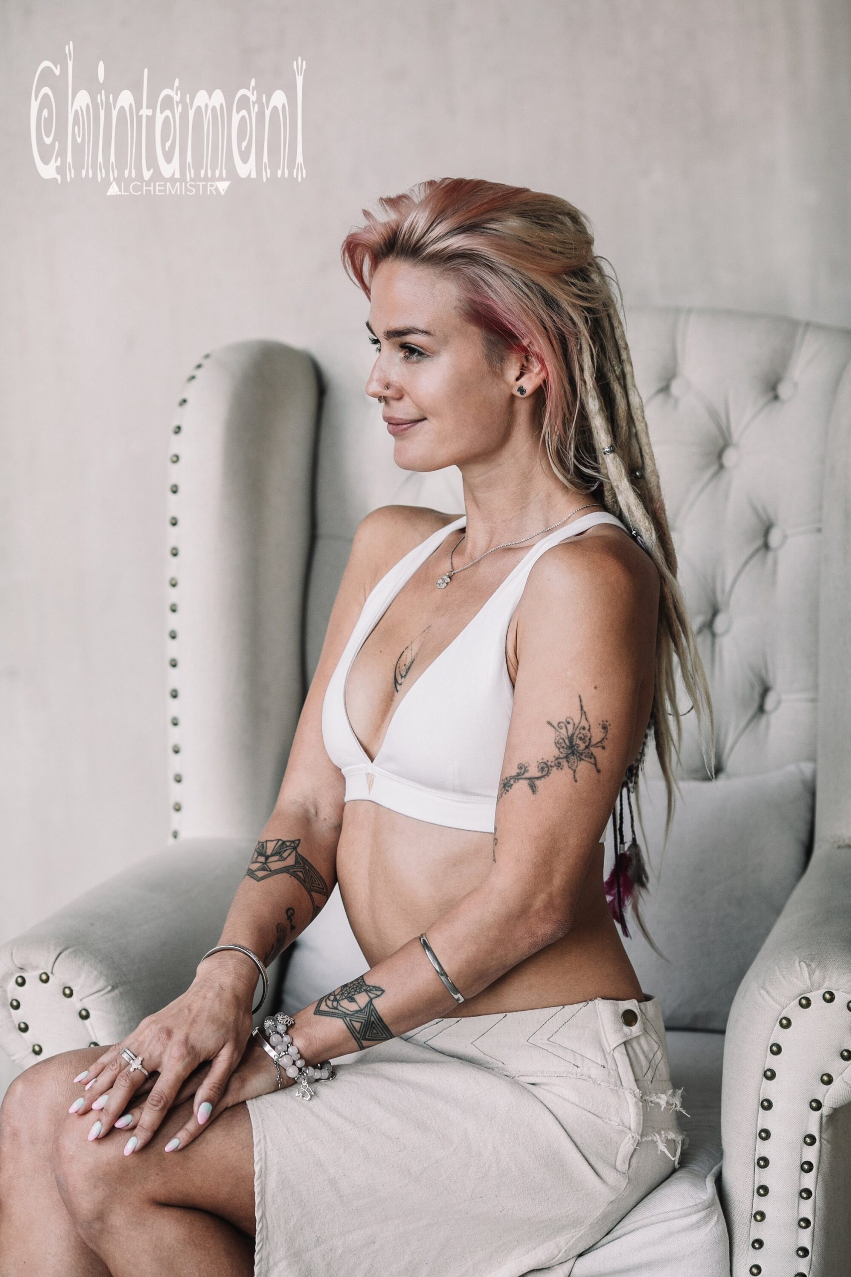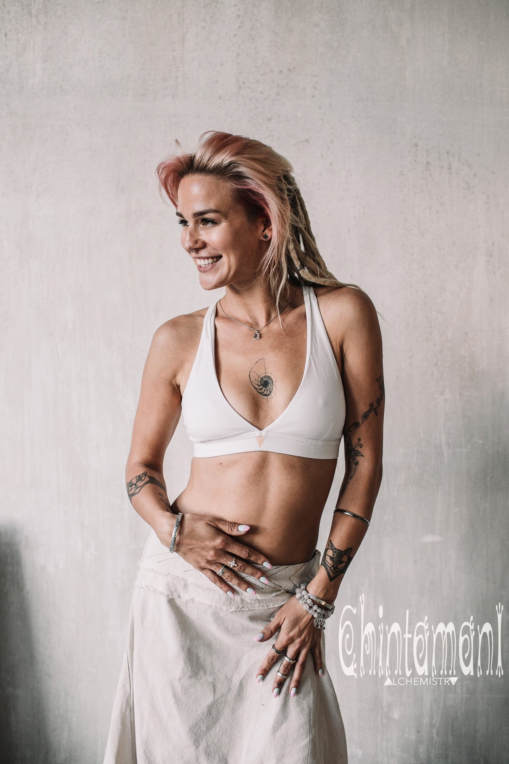 Soft and natural off white Yoga Bra Top for sport, beach holiday or everyday use. This women halter top made of 90 % cotton and 10 % lycra is that useful little detail of wardrobe, that will let you wear all those semitransparent kimonos, dresses, tunics carelessly and comfortably. It comes in 4 natural and most universal colors – cream off white, black, mint and brown. Natural fabric and lack of any restricting hard frame or tight straps creates divine feeling of freedom. It is quite sporty to wear as a self sufficient top. Besides, there is a little golden decorative ornament in the front to reassure that option. But you can easily wear this bra as a beach swimsuit or even put some push up padding into specially designed pockets and use it as underwear. In any way this wonderful artifact from Chintamani Alchemistry will look irresistibly sensual and feel just right!